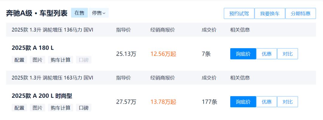 《次世代車研所》欄目發(fā)現(xiàn),近期奔馳旗下多款車型,如A級、C級、EQA、EQB等都迎來了大幅度降價,最低相當(dāng)于打五折。上海有經(jīng)銷商給出的奔馳A級報價僅12.56萬元,創(chuàng)下了價格新低。