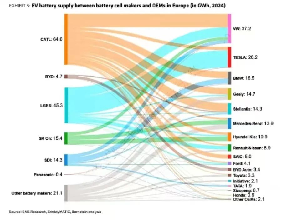 在歐洲市場(chǎng),寧德時(shí)代最大的客戶是大眾汽車,2024年,寧德時(shí)代26%的歐洲出貨量供應(yīng)給大眾汽車。Stellantis(16%)、寶馬(13%)和吉利(13%)也是其主要客戶,西班牙工廠投產(chǎn)后,對(duì)Stellantis的供貨量還將增加。