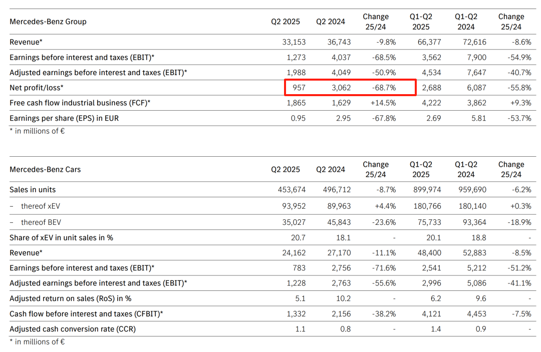 奔馳也面臨銷售困境,凈利潤(rùn)暴跌69%。從奔馳2025年二季報(bào)來看,奔馳集團(tuán)凈利潤(rùn)同比大幅下降69%,銷量下滑了9%,其中在華銷量下滑14%。去年同期,奔馳一個(gè)季度能凈賺30.62億歐元,今年卻只能賺9.57億歐元。