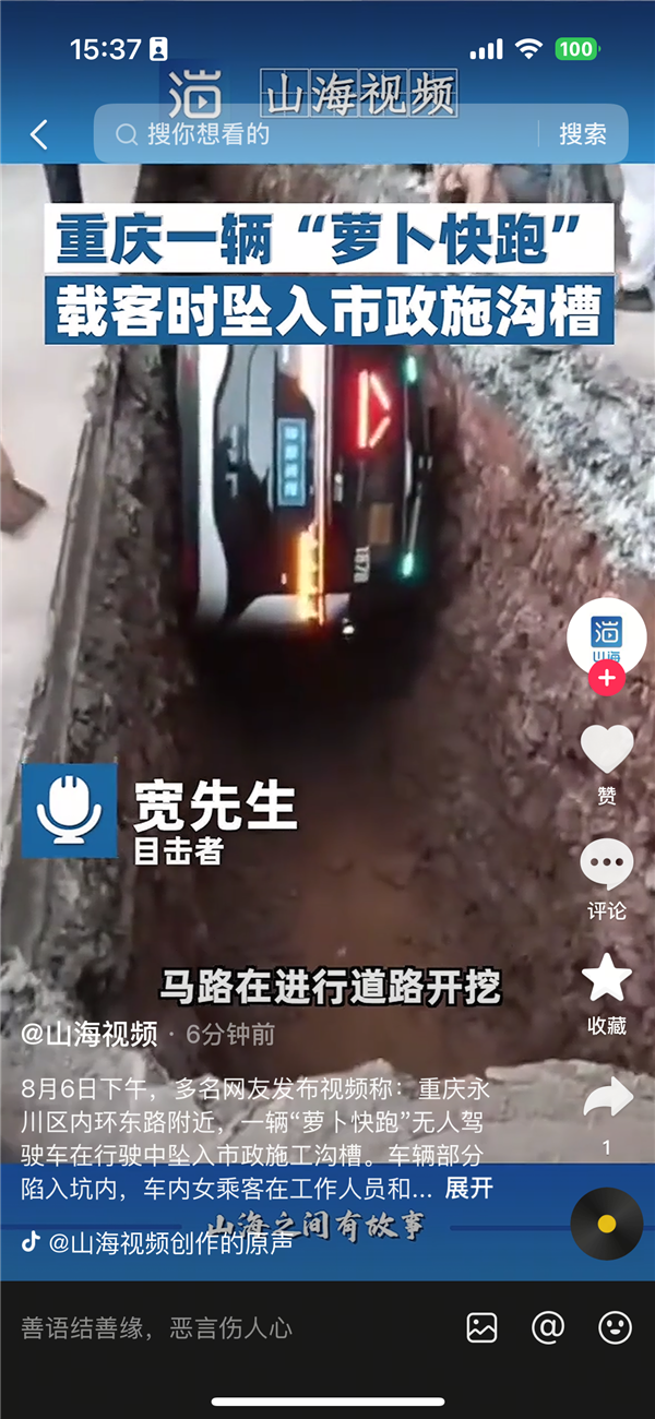 8月7日,多名網(wǎng)友發(fā)布視頻顯示,重慶永川區(qū)內(nèi)環(huán)東路附近,一輛“蘿卜快跑”無人駕駛車行駛時墜入市政施工溝槽。