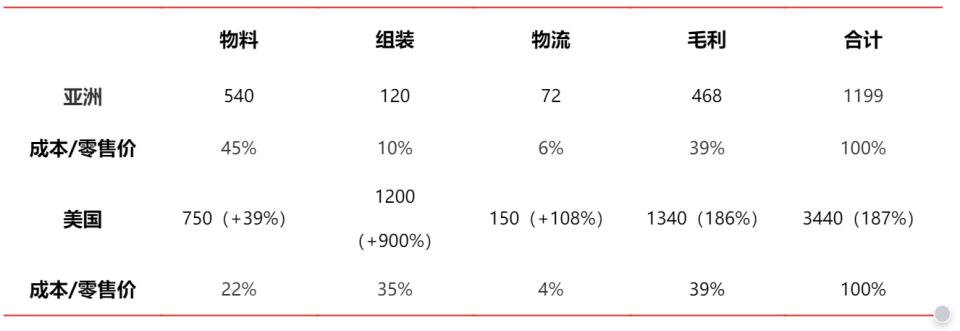 在物料、組裝和物流成本超2000美元的情況下,要保證39%的毛利率,一部純美國產(chǎn)的iPhone最終零售價(jià)格將達(dá)3440美元,是亞洲生產(chǎn)的2.86倍,僅組裝成本就超過了在亞洲制造的iPhone的零售價(jià)格。