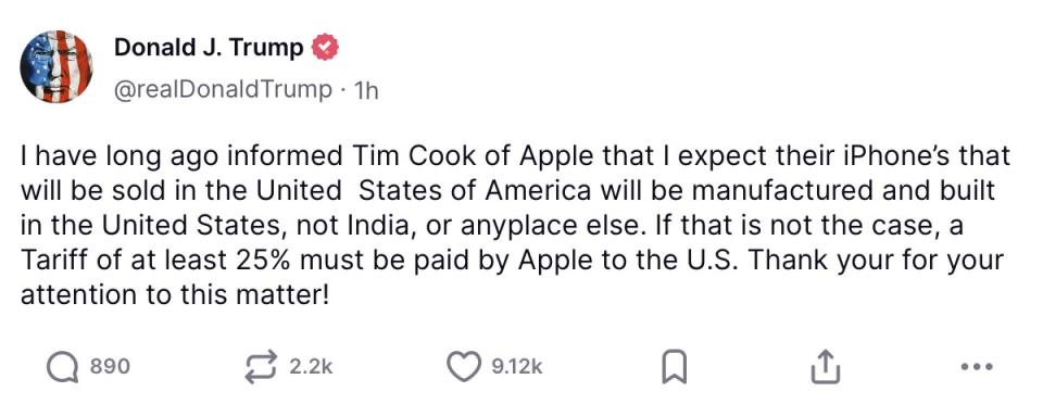 特朗普此前在社交媒體上對蘋果發(fā)出“關(guān)稅威脅”