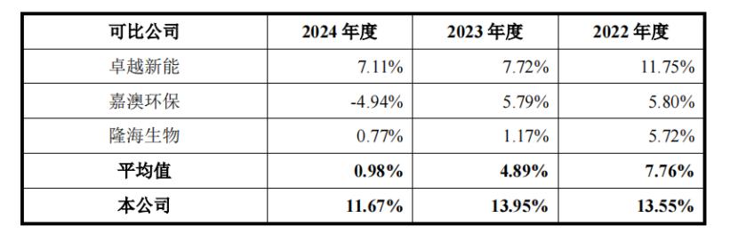A股上市公司中,卓越新能、嘉澳環(huán)保、隆海生物的業(yè)務(wù)與豐倍生物具有相似性。與同行業(yè)公司相比,豐倍生物的綜合毛利率較高,主要是因?yàn)楣井a(chǎn)品結(jié)構(gòu)、客戶結(jié)構(gòu)等存在差異,相關(guān)政策對(duì)毛利率影響程度不同。