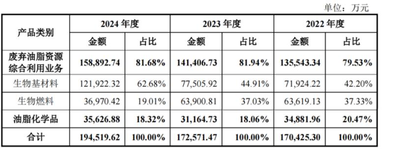 豐倍生物的主營(yíng)業(yè)務(wù)收入中,廢棄油脂資源綜合利用業(yè)務(wù)占比約80%,是主營(yíng)業(yè)務(wù)收入的主要構(gòu)成。其中,2022年至2024年,生物基材料占比由42.2%提升至62.68%;生物燃料的占比由37.33%降至19.01%。