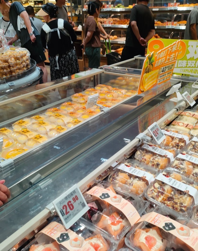 該店位于河南省鄭州管城回族區(qū)鳳凰路38號,面積約800㎡。門店主要經(jīng)營生鮮和食品,還有部分日化商品,沒有現(xiàn)場加工的食品。不過,鮮風(fēng)生活的各種烘焙、熟食及食品爆款陳列十分突出。