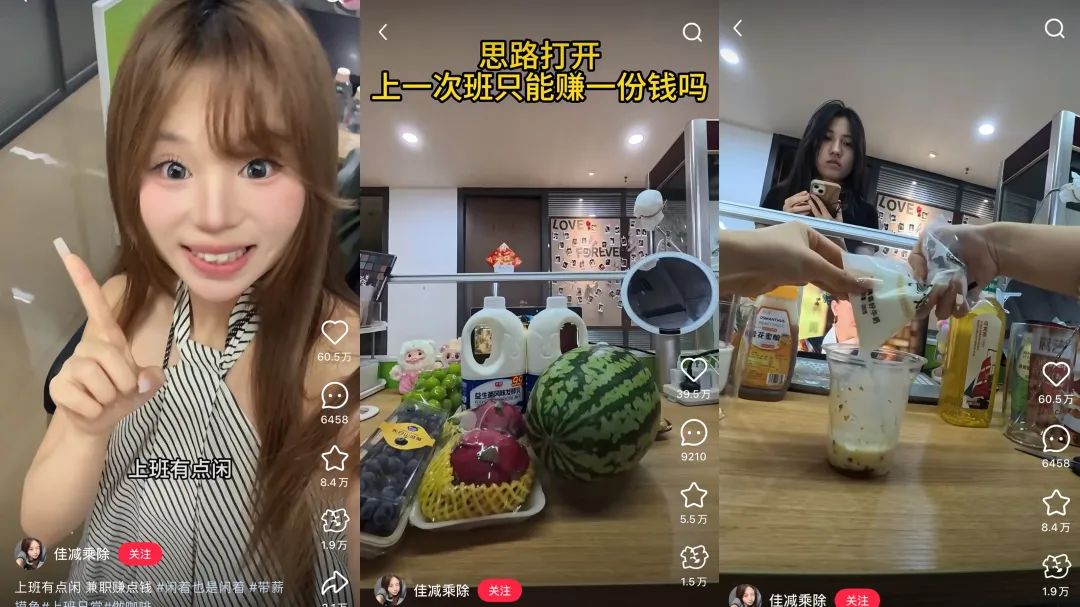 在@佳減乘除的視頻中,同事們到她的工位點(diǎn)飲品,博主熟練地?cái)D蜂蜜、加牛奶和冰塊,迅速調(diào)制出特飲,動(dòng)作一氣呵成,同事們付錢離開。最后結(jié)算,一天能賺200元以上。