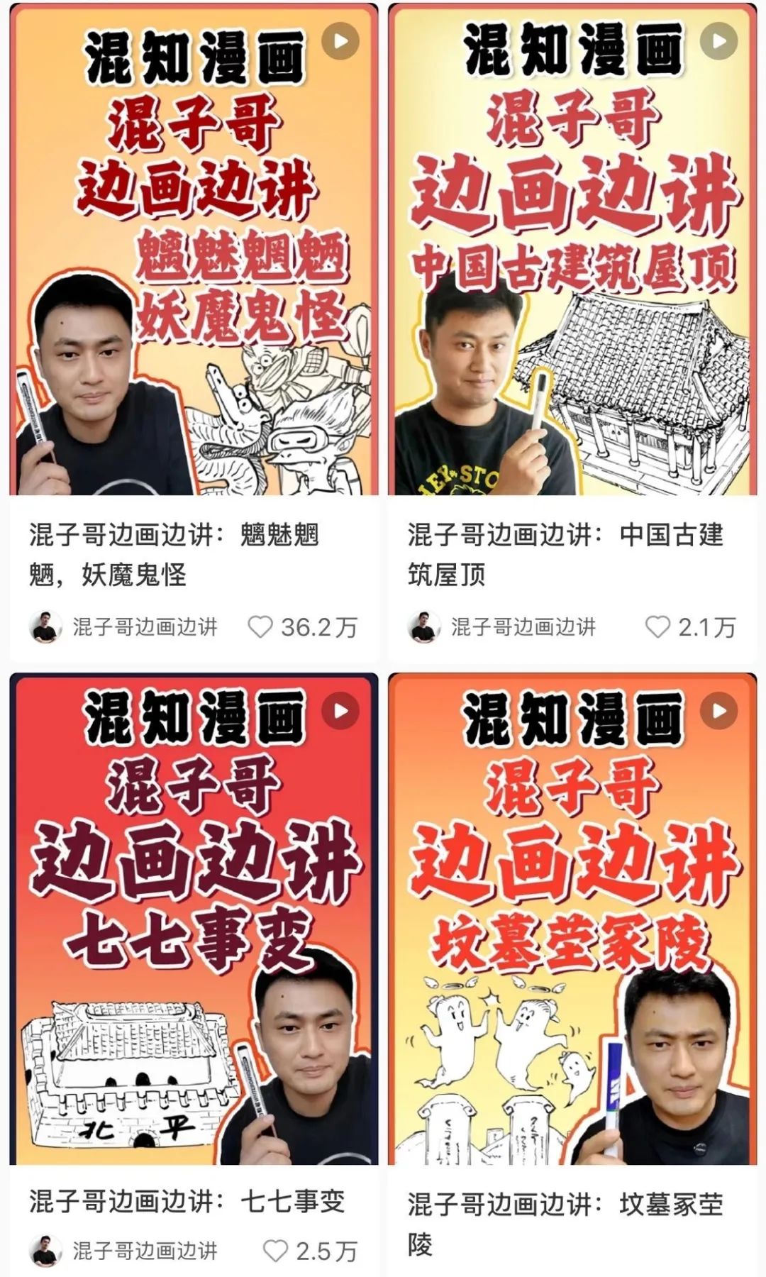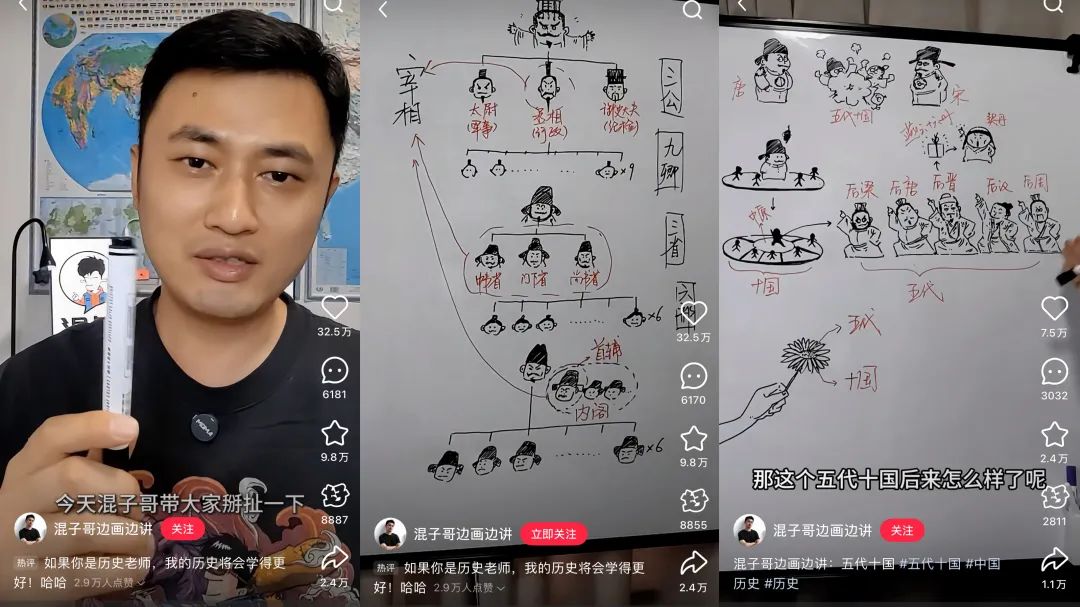 “邊畫邊講”是該賬號的主要內(nèi)容形式和核心優(yōu)勢。每次混子哥都會(huì)選定一個(gè)主題,帶著邪魅挑眉的動(dòng)作開講,一邊在白板上熟練畫畫,一邊講解簡明易懂的知識(shí)。