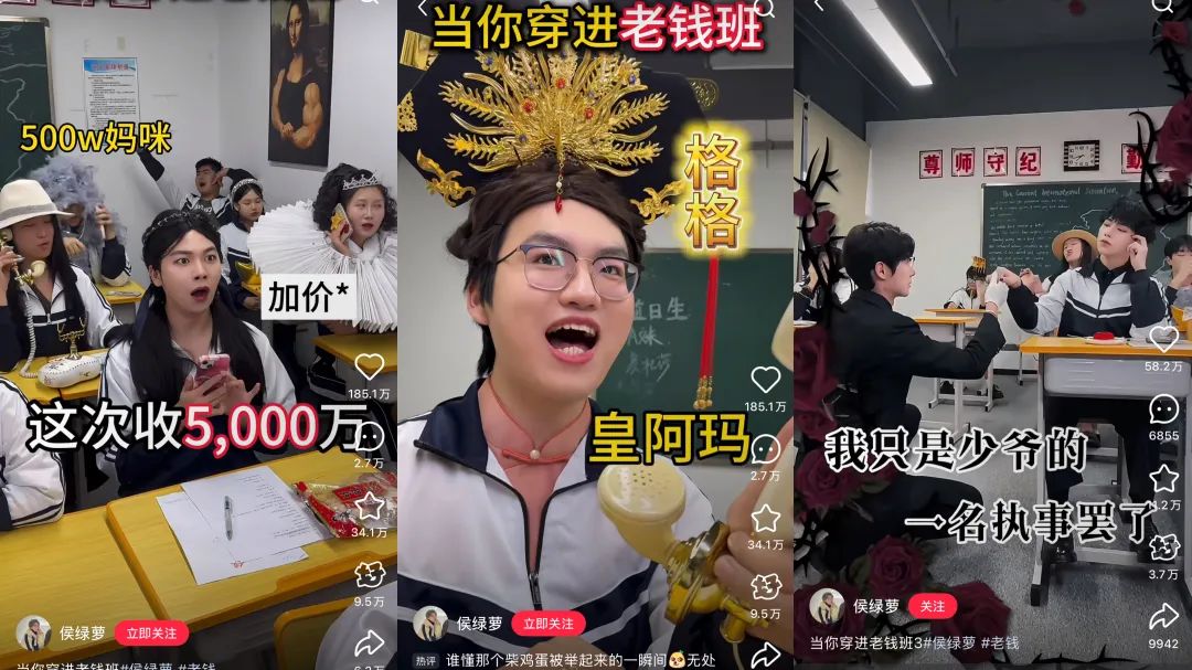 另一個(gè)是劇情博主@侯綠蘿。此前,她就憑借腦洞大開的劇情演繹在小紅書收獲近300萬粉絲,7月因新系列再度漲粉52萬。視頻中,主角侯綠蘿穿越進(jìn)“老錢班”,同學(xué)們身份顯貴,不是格格就是少爺、公主,家產(chǎn)成謎,侯綠蘿則靠代寫作業(yè)、記筆記和做值日賺錢。