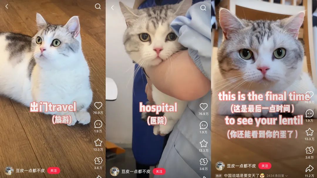 比如其近期爆款視頻講述豆皮做絕育的故事——“這天我爸說要帶我出門travel,結(jié)果突然來到一家hospital,他說來到這里是為了幫我解決trouble,可是這里的people看起來就非常awful,我躺在table上面喊了一聲uncle,他說this is the final time to see your lentil”,流利的rap配上豆皮自閉的表情,畫面喜感十足。最終這支視頻獲76.8萬次點(diǎn)贊,豆皮成了小紅書最會(huì)單押的小貓rapper。