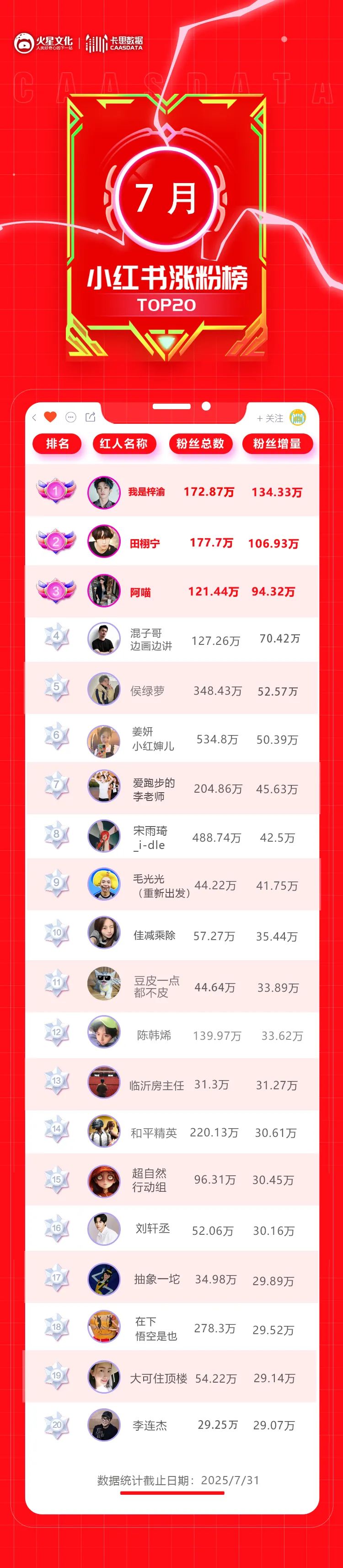 藝人@我是梓渝以134萬的漲粉成績位居榜首,漲粉超106萬的@田栩?qū)幘o隨其后,兩人都因出演柴雞蛋改編劇《逆愛》在小紅書收獲了大量CP粉。值得注意的是,7月小紅書漲粉榜中,明星、藝人數(shù)量不少,這表明小紅書的明星生態(tài)已漸趨成熟。