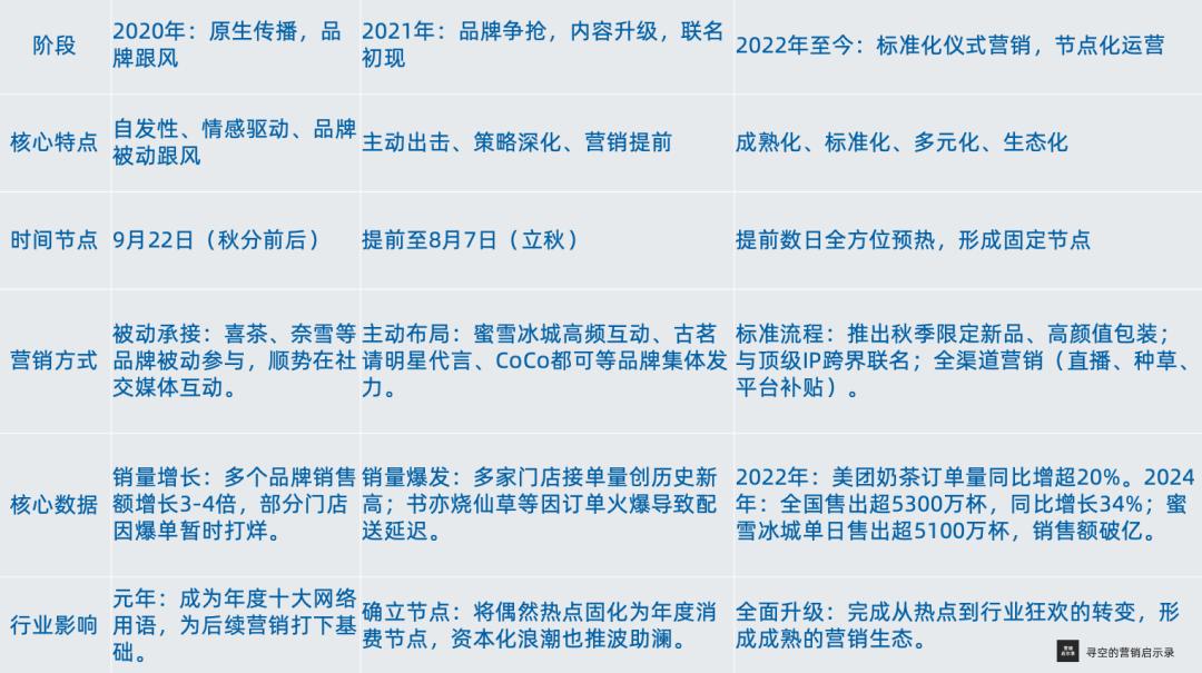 “秋天的第一杯奶茶”的興起,經(jīng)歷了用戶自發(fā)、品牌跟風(fēng)到全行業(yè)主動策劃這三個(gè)階段。正是這三個(gè)階段的發(fā)展,讓它成為了國民級的營銷IP。