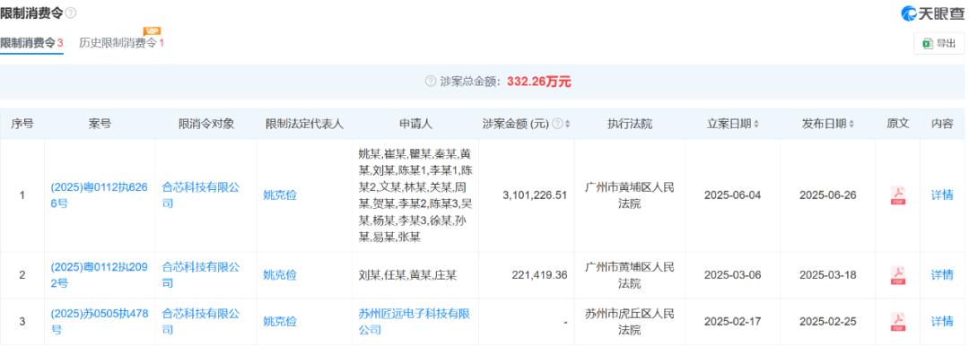 天眼查信息還顯示,近期合芯科技被廣州市黃埔區(qū)市場監(jiān)督管理局列入經(jīng)營異常,原因是“通過登記的住所或者經(jīng)營場所無法聯(lián)系”。合芯科技被執(zhí)行總金額為2131萬元,法人姚克儉三次被限消,涉案金額332萬元。