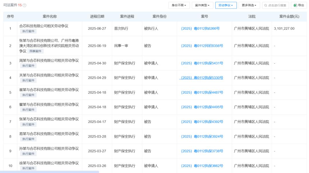天眼查信息顯示,自今年2月起,合芯科技有15起勞動爭議案件,多數(shù)案程進(jìn)入財(cái)產(chǎn)保全執(zhí)行階段。