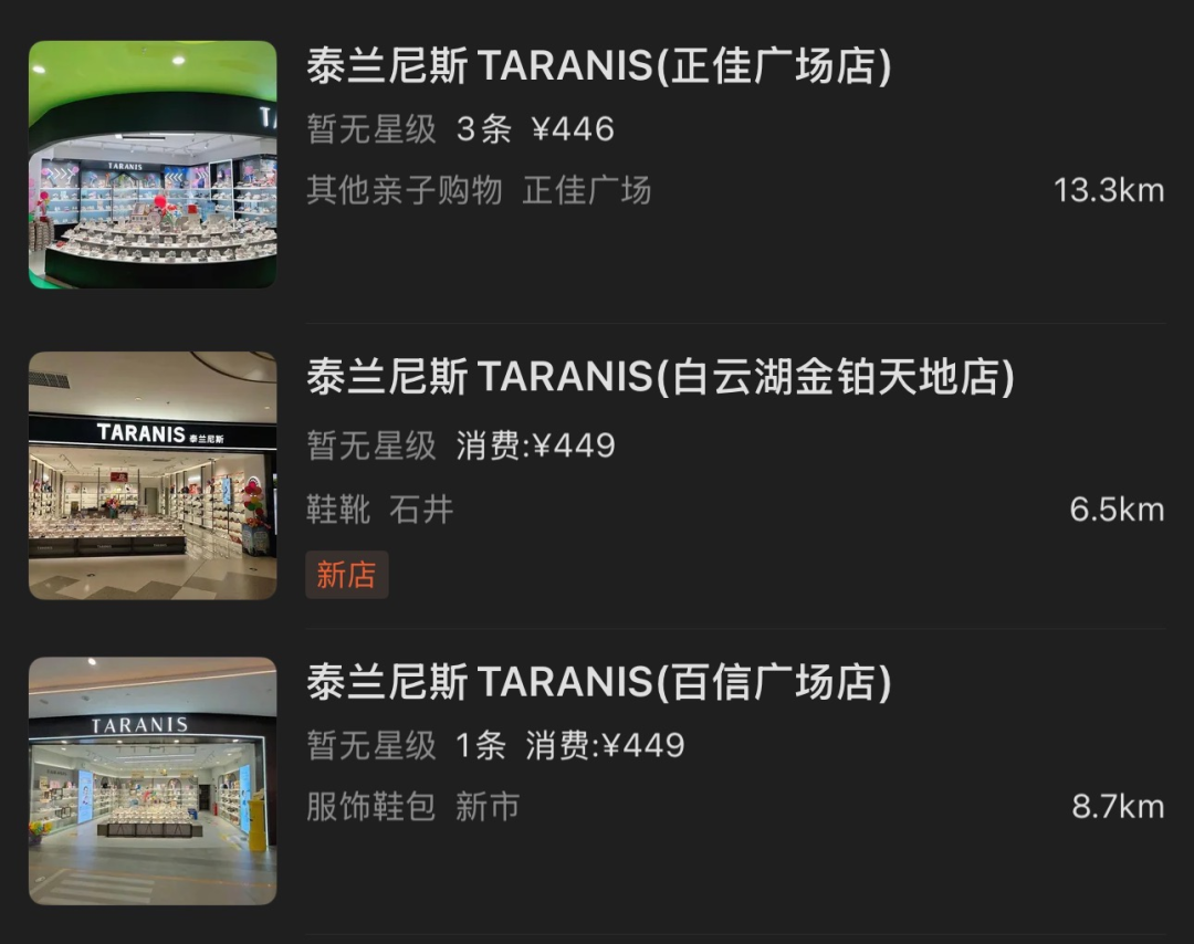 泰蘭尼斯廣州部分線下門店 | 截圖來源于大眾點評