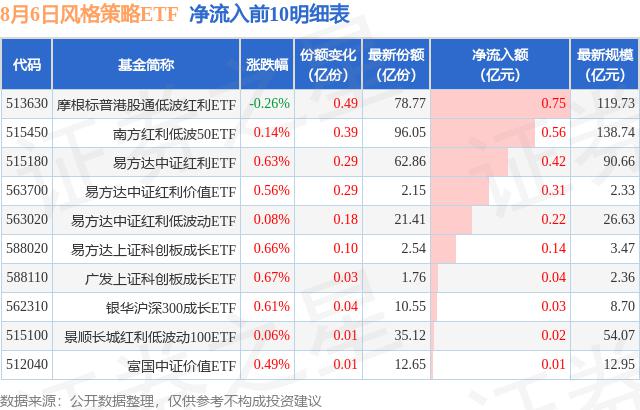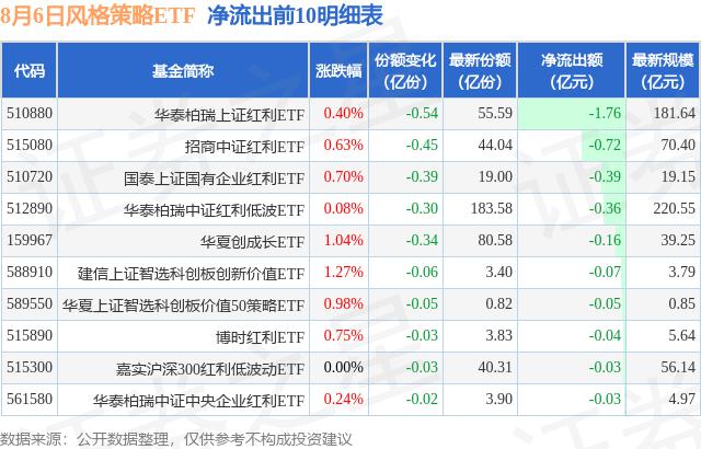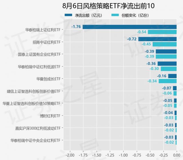 當日也有10只風格策略ETF基金出現(xiàn)資金凈流出,華泰柏瑞上證紅利ETF(510880)凈流出排首位,其份額減少了5400.0萬份,凈流出額為1.76億元。