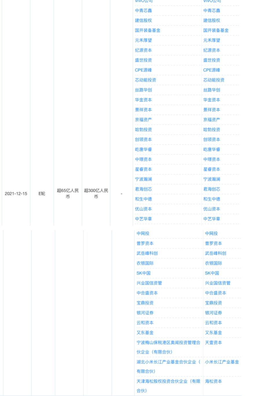 參投的知名機(jī)構(gòu)包括TCL創(chuàng)投、小米長江產(chǎn)業(yè)基金、vivo公司、華為哈勃投資、韓國SK集團(tuán)旗下SK中國等。
