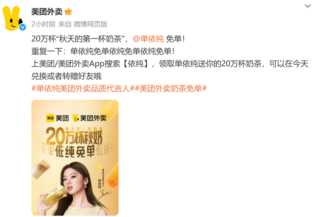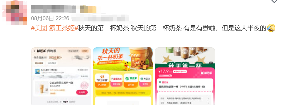 另外,8月7日美團(tuán)外賣宣布#美團(tuán)外賣奶茶免單100萬杯#今天是最后一天,同時(shí),今天20萬杯“秋天的第一杯奶茶”免單!