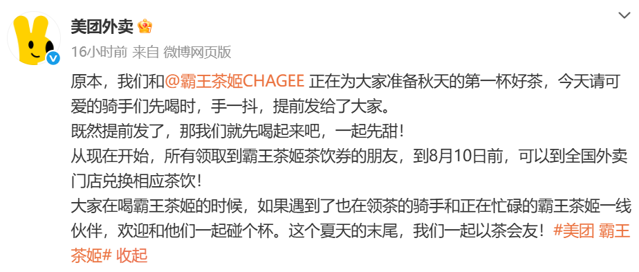 8月6日,美團(tuán)外賣發(fā)博回應(yīng):原本,我們和 霸王茶姬正在為大家準(zhǔn)備秋天的第一杯好茶,今天請(qǐng)可愛的騎手們先喝時(shí),手一抖,提前發(fā)給了大家。既然提前發(fā)了,那我們就先喝起來吧,一起先甜!