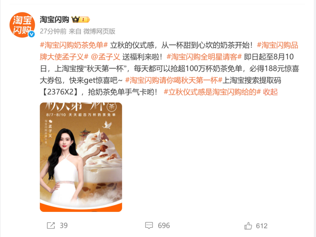 淘寶閃購宣布即日起至8月10日,上淘寶搜“秋天第一杯”,每天搶超100萬杯奶茶免單。