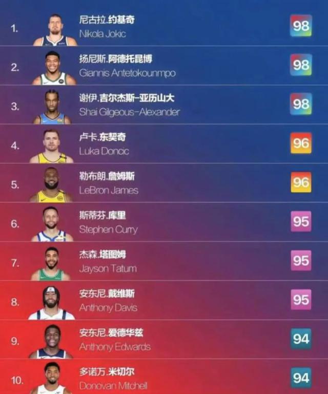 說到這里,順便給大家說一下2K26的初始評分排名。約基奇、字母哥、SGA三人以98分的總評并列最高,不過排名有先后順序。湖人隊(duì)的兩位巨頭東契奇、詹姆斯都是96分,一起進(jìn)入了前五。庫里、塔圖姆、戴維斯是95分,愛德華茲和米切爾是94分,以上這些就是本屆2K26排名前十的球員。