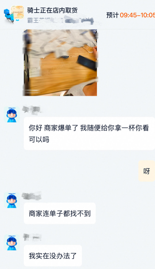 有網(wǎng)友只點(diǎn)了一杯奶茶,卻收到多杯;也有網(wǎng)友下單晚餐,等了兩小時(shí)都沒(méi)接到騎手電話;還有網(wǎng)友曬出與騎手的聊天截圖,騎手稱商家爆單太混亂,自己擠不進(jìn)去仔細(xì)辨認(rèn)訂單信息,就隨手拿了兩杯奶茶送過(guò)來(lái)。