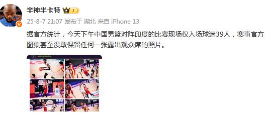 媒體人半神半卡特透露,據(jù)官方統(tǒng)計,當(dāng)天下午中國男籃對陣印度的比賽現(xiàn)場,僅39名球迷入場。甚至賽事官方圖集都沒敢保留任何一張露出觀眾席的照片。