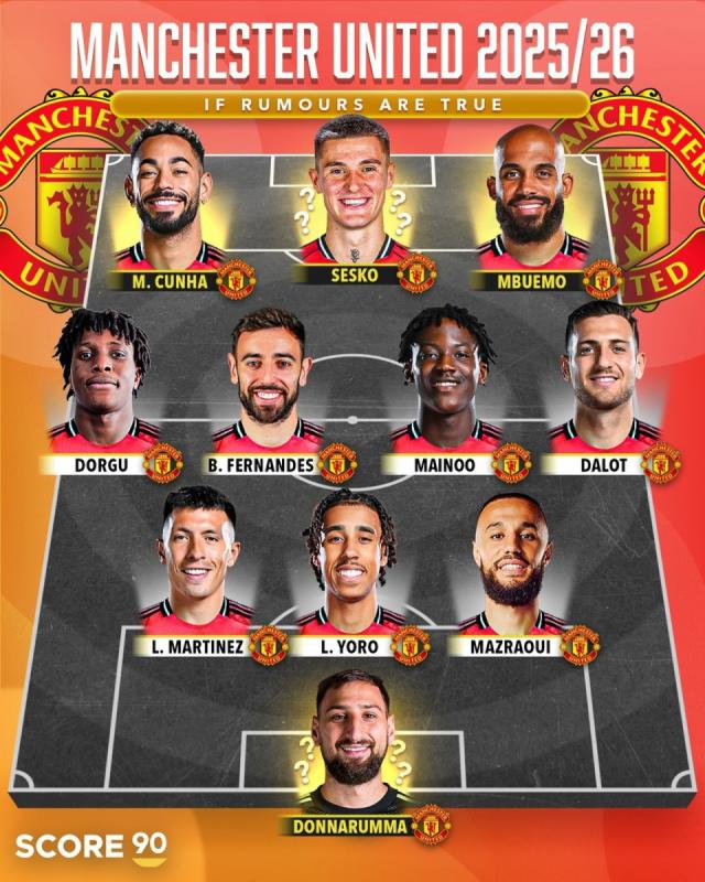 外媒SCORE90根據已經完成的轉會和外界傳聞,制作了新賽季曼聯的潛在首發(fā)陣容。在這套3 - 4 - 3陣型的曼聯新賽季首發(fā)中,進攻三叉戟是由姆貝莫、塞斯科和庫尼亞組成的全新組合。不計算附加條款,曼聯在這三人身上花費了2.24億歐的轉會費。
