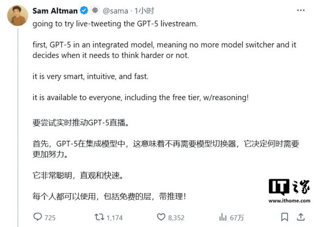 該公司首席執(zhí)行官山姆?奧爾特曼(Sam Altman)在X平臺發(fā)布推文,將GPT - 5模型的亮相比作蘋果初代iPhone,認為用戶體驗后便難以割舍。這一代語言模型在推理、準(zhǔn)確性和速度方面有顯著提升,使互動體驗更接近專家水平。