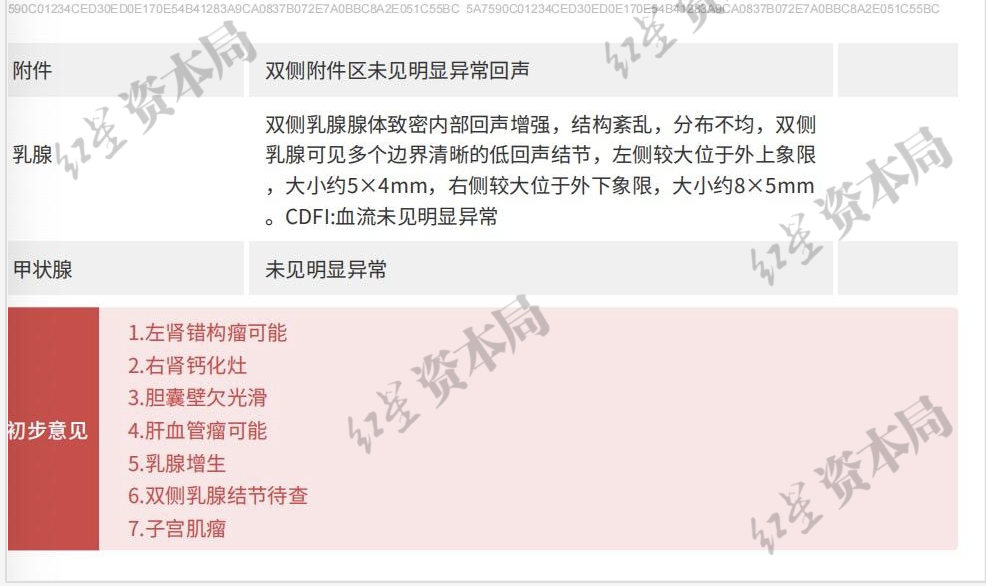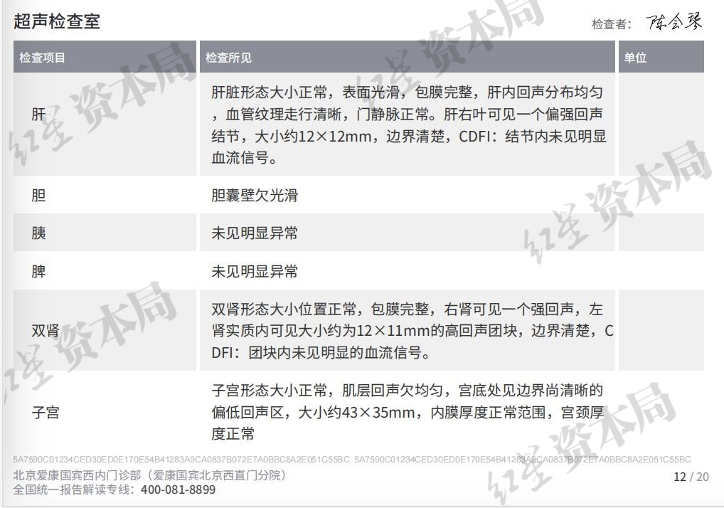 據(jù)紅星資本局此前報(bào)道,7月30日,張曉玲提供了2023年在愛(ài)康國(guó)賓的體檢報(bào)告,超聲檢查雙腎一欄寫(xiě)著“雙腎形態(tài)大小位置正常,包膜完整,右腎可見(jiàn)一個(gè)強(qiáng)回聲,左腎實(shí)質(zhì)內(nèi)可見(jiàn)大小約為12x11mm的高回聲團(tuán)塊,邊界清楚,CDFI:團(tuán)塊內(nèi)未見(jiàn)明顯的血流信號(hào)?!?/p>