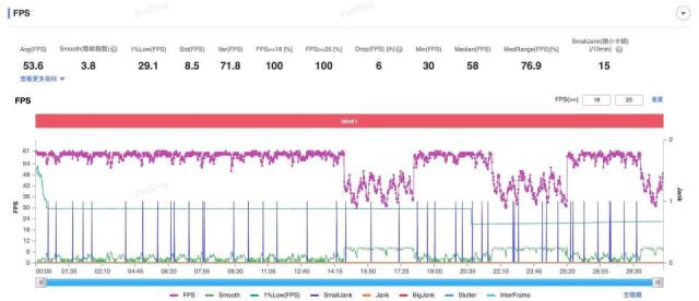 接著進(jìn)行《星穹鐵道》半小時(shí)“黃金的時(shí)刻”測(cè)試,平均幀率 53.6fps。