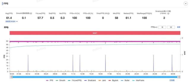 平均幀率 61.4fps,1% Low 幀達(dá)到 57.7fps。