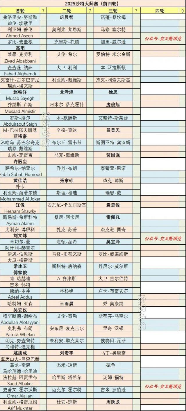 此外,沙特大師賽前四輪結(jié)束后,16位晉級32強(qiáng)的球員無需抽簽,直接對陣賽會TOP16種子球員。去年首屆比賽,因簽表問題,四五輪對接時進(jìn)行了臨時調(diào)整。本屆簽表不會出現(xiàn)此類問題。這樣一來,中國的四位TOP16球員,在第五輪(相當(dāng)于正賽首輪)可能的對手分別是:趙心童可能對陣上周躍龍和吉米 - 羅伯遜的勝者,丁俊暉可能對陣馬奎爾和沃頓的勝者,斯佳輝可能對陣吳宜澤和羅比 - 威廉姆斯的勝者,張安達(dá)可能對陣賓漢姆和賀國強(qiáng)的勝者。另外,“囧哥”也有可能再次碰上雷佩凡。