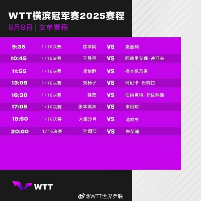 女單賽程里,中韓對決壓軸上演。世界排名前三的孫穎莎、王曼昱、陳幸同都會亮相,分別對陣韓國選手朱芊曦、波多黎各一姐迪亞茲、法國主力袁嘉楠。此外,小勒布倫、張本美和等人也會出戰(zhàn)。