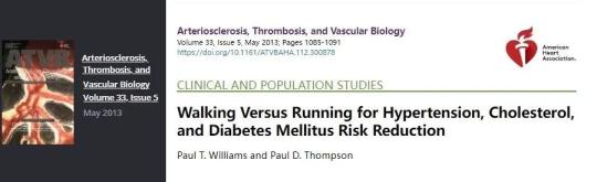 ①Williams PT, Thompson PD. Walking versus running for hypertension, cholesterol, and diabetes mellitus risk reduction. Arterioscler Thromb Vasc Biol. 2013;33(5):1085-91.