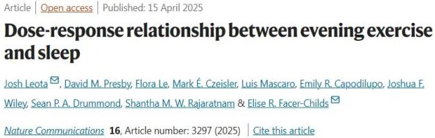 ④Leota, J., Presby, D.M., Le, F. et al. Dose-response relationship between evening exercise and sleep. Nat Commun 16, 3297 (2025). https://doi.org/10.1038/s41467-025-58271-x
