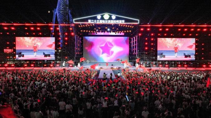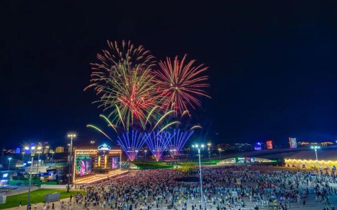 絢爛的高空煙花劃破夜空,綻放出浪漫畫卷,每一朵煙花都訴說著冰城的熱情與活力。繽紛的火花如星光灑落,與人們的笑顏交相輝映,勾勒出夏日美好詩篇。