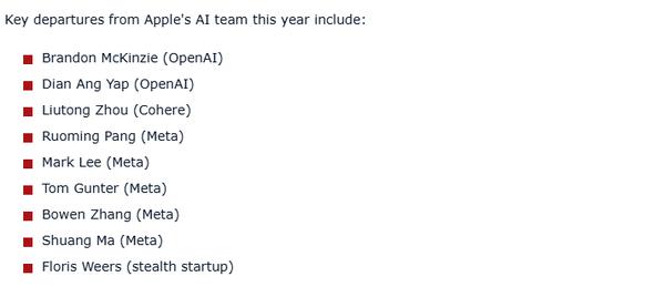 【CNMO 科技消息】據(jù)英國《金融時報》報道,自今年 1 月起,蘋果公司約十幾位人工智能領(lǐng)域的關(guān)鍵人才跳槽至競爭對手公司,這讓蘋果成為硅谷激烈的人工智能人才爭奪戰(zhàn)的主要受害者之一。尤其是蘋果 AI 團(tuán)隊的高級研究人員紛紛轉(zhuǎn)投 Meta、OpenAI、xAI、Cohere 等公司,給蘋果帶來了重大挑戰(zhàn)。