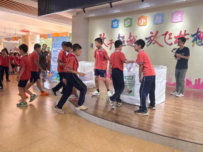 江海區(qū)實(shí)驗(yàn)小學(xué)的“環(huán)保小喇叭”提醒同學(xué)們分類回收舊書本、文具;