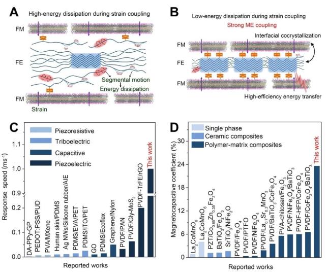圖2 納米復(fù)合薄膜的磁電耦合機(jī)理以及性能對(duì)比圖。(A)低結(jié)晶度和(B)高結(jié)晶度下磁電耦合過(guò)程的機(jī)理示意圖。(C)磁電傳感器的響應(yīng)速度對(duì)比圖。(D)磁電復(fù)合薄膜的磁容系數(shù)對(duì)比圖。