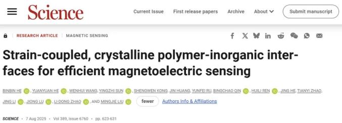 2025年8月8日,國(guó)際頂級(jí)學(xué)術(shù)期刊《Science》以在線(xiàn)全文Research Article形式發(fā)表了北航團(tuán)隊(duì)在柔性磁電材料領(lǐng)域的最新研究:《Strain-coupled, crystalline polymer-inorganic interfaces for efficient magnetoelectric sensing》。該研究通過(guò)界面共晶策略成功制備高性能聚合物 - 無(wú)機(jī)納米復(fù)合薄膜,為柔性磁電材料設(shè)計(jì)與應(yīng)用開(kāi)辟新路徑。團(tuán)隊(duì)對(duì)鐵磁性二硒化釩(VSe?)單層表面進(jìn)行重氮化修飾,在鐵磁性納米片與鐵電性高分子聚偏二氟乙烯(PVDF)間構(gòu)建亞分子級(jí)平整界面結(jié)構(gòu)。這種高度結(jié)晶的復(fù)合界面抑制能量耗散、提高能量傳遞效率,制得的復(fù)合薄膜磁電性能卓越,磁容系數(shù)達(dá)23.6%,磁電響應(yīng)速度超快(1 ms - 1)。該器件還實(shí)現(xiàn)與熱電器件交叉集成,集成器件信號(hào)輸出穩(wěn)定,為可穿戴設(shè)備創(chuàng)新發(fā)展提供新策略。