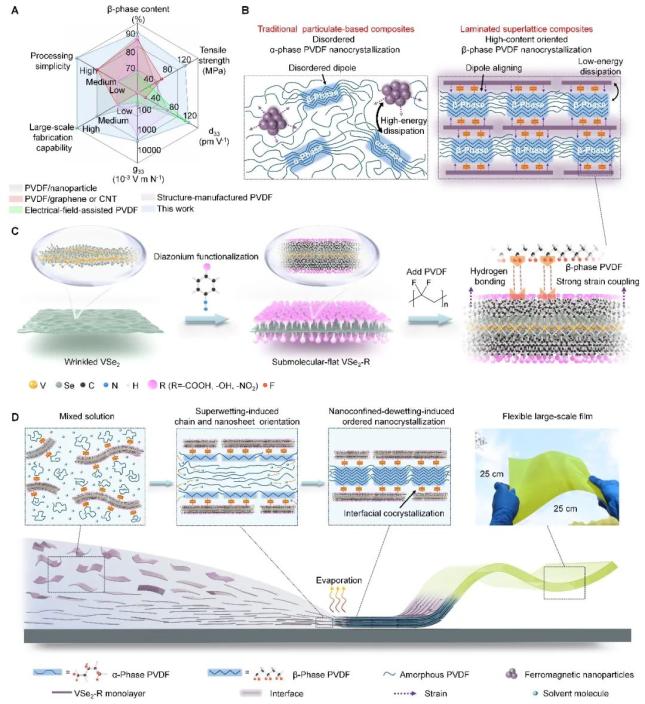 圖1 高性能磁電薄膜的制備。(A)典型聚合物基鐵性材料的性能雷達(dá)圖對(duì)比。(B)傳統(tǒng)顆?;烹姀?fù)合材料與層狀磁電復(fù)合材料的結(jié)構(gòu)示意圖。(C)VSe2、重氮化修飾VSe2以及誘導(dǎo)PVDF的β相成核示意圖。(D)磁電薄膜的制備過(guò)程與機(jī)理示意圖。