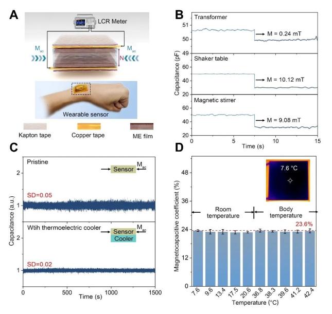 基于薄膜優(yōu)異特性,團(tuán)隊(duì)制備可穿戴磁電傳感器。該傳感器能實(shí)時(shí)監(jiān)測(cè)磁場(chǎng),與熱電冷卻模塊集成后穩(wěn)定性提升,磁容系數(shù)在寬溫域內(nèi)穩(wěn)定。