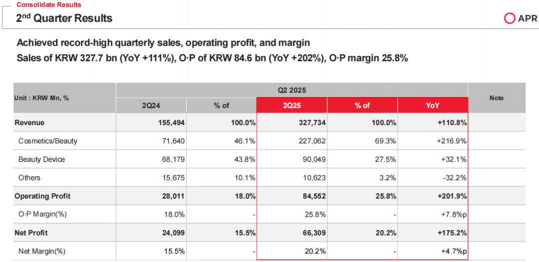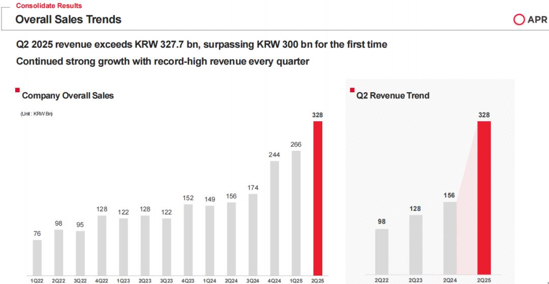 詳細(xì)來看,2025年Q2營業(yè)收入達(dá)3277.3億韓元(約合人民幣17億元),較上年同期增長110.8%,這也是APR首次單季度營收超3000億韓元(約合人民幣15.5億元);營業(yè)利潤同比大幅增長201.9%,至845.5億韓元(約合人民幣4.4億元);凈利潤為663.1億韓元(約合人民幣3.4億元),同比增長175.2%。