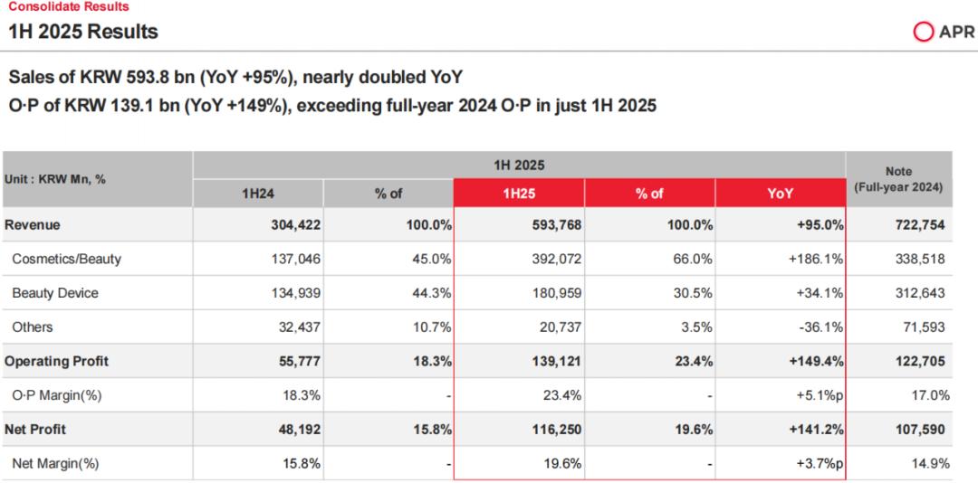 8月6日,韓國美容科技企業(yè)APR公布2025年上半年及第二季度業(yè)績報(bào)告。報(bào)告顯示,上半年?duì)I收和利潤均大幅增長,營業(yè)利潤與凈利潤超過2024年全年。
