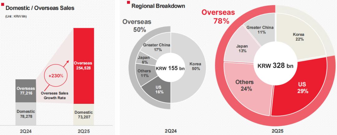 據(jù)財(cái)報(bào)披露,APR2025年Q2海外地區(qū)營收2545.28億韓元(約合人民幣13.2億元),同比增長230%,占總營收比重從去年同期的50%躍升至78%,成為核心增長動力。