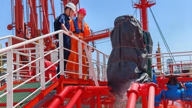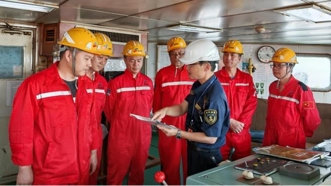 舟山海事局執(zhí)法人員正在進(jìn)行船載危險貨物高溫作業(yè)安全宣教。舟山岱山海事處 翟亞洲 攝