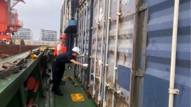 舟山海事局執(zhí)法人員正在檢查集裝箱。舟山岱山海事處 諸葛麗云 攝