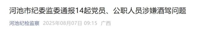8月7日,廣西河池市紀(jì)委監(jiān)委通報了14起黨員、公職人員涉嫌酒駕問題,具體情況如下: