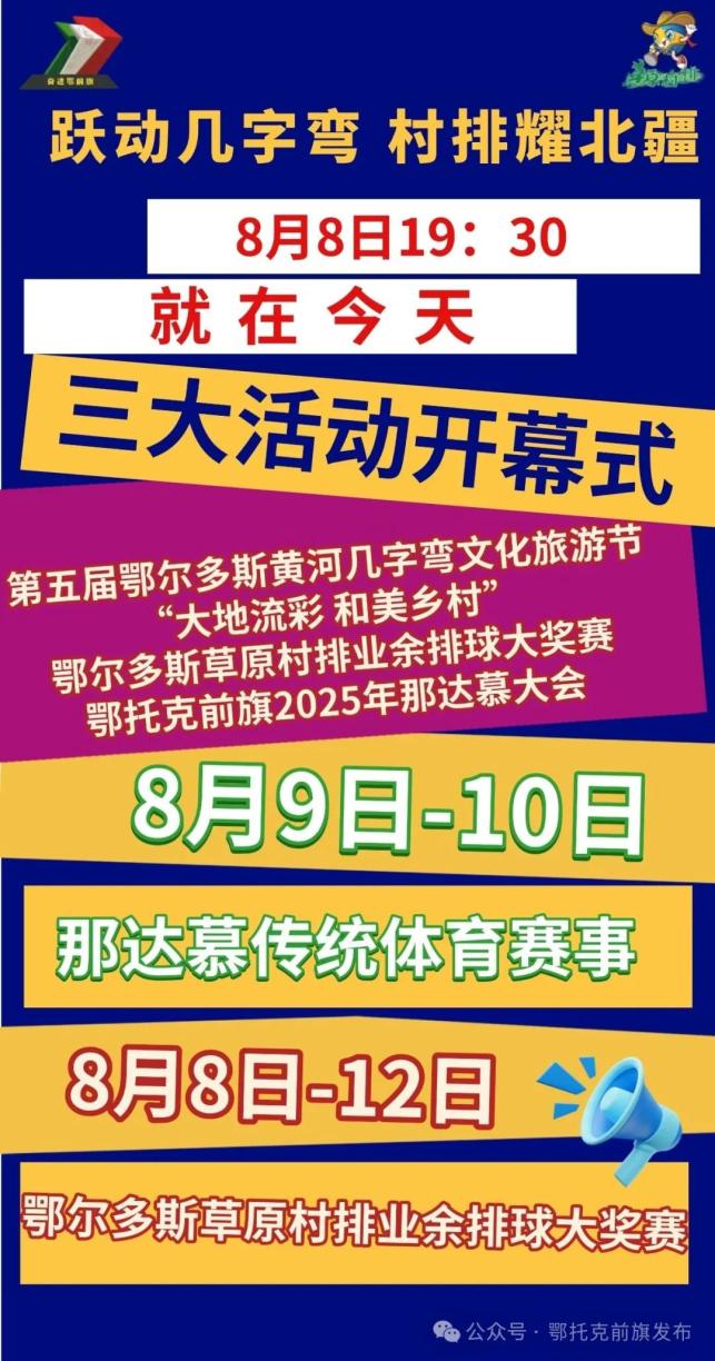 躍動幾字彎 村排耀北疆——第五屆鄂爾多斯黃河幾字彎文化旅游節(jié)、“大地流彩 和美鄉(xiāng)村”鄂爾多斯草原村排業(yè)余排球大獎賽、鄂托克前旗2025年那達慕大會,三大盛會將同步開啟!
