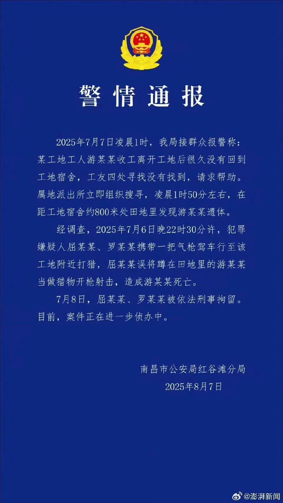 8月7日晚,南昌市公安局紅谷灘分局發(fā)布警情通報(bào),7月6日晚,54歲的湖南婁底籍農(nóng)民工游某某,在江西南昌一施工工地附近草叢如廁時(shí),被人誤當(dāng)獵物遭槍擊身亡,此事引發(fā)廣泛關(guān)注。